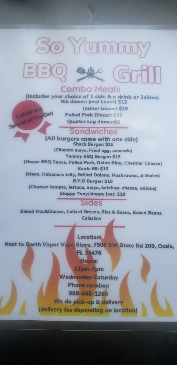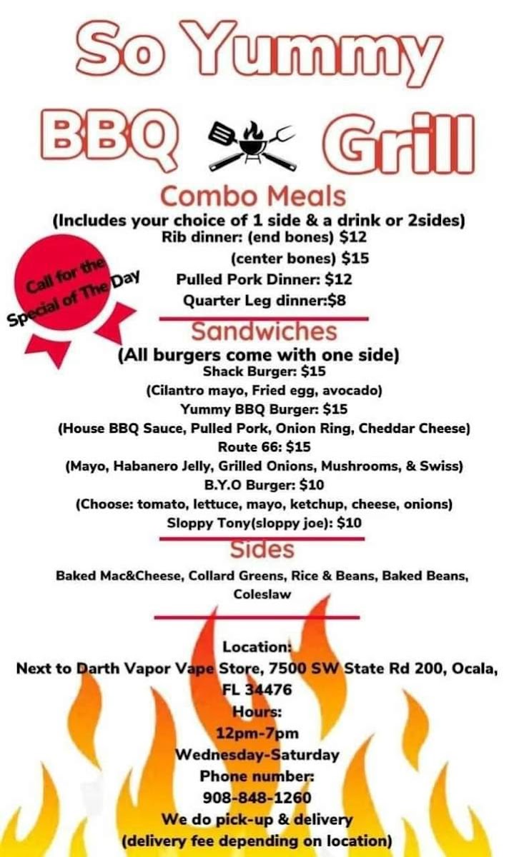 At So Yummy BBQ & Grill, located in Ocala, FL, So Yummy Bbq & Grill Menu offers a variety of hearty and satisfying options. For those craving a filling meal, the Combo Meals are a great choice, including the Rib Dinner, Pulled Pork Dinner, and Quarter Leg Dinner. Each of these plates showcases deliciously cooked meats that are tender and flavorful. If you're in the mood for something more handheld, the Shack Burger, Yummy BBQ Burger, and Route 66 B.Y.O Burger all make for tasty, juicy burgers. For a twist, the Sloppy Tony is a crowd favorite, sure to satisfy your cravings for something savory and comforting.