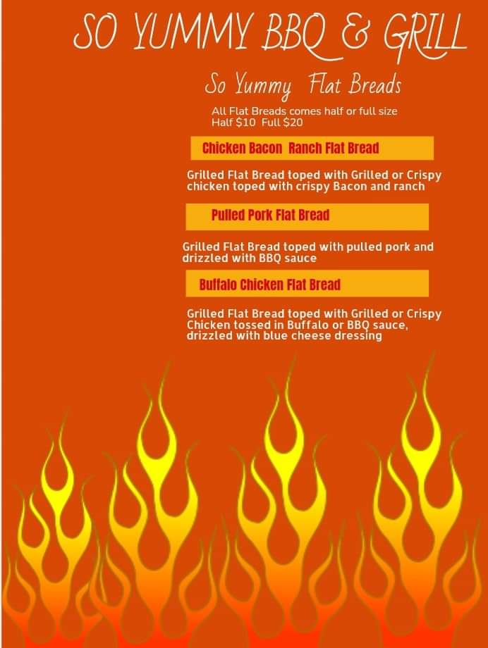 On the side, you'll find some delicious accompaniments such as Baked Mac & Cheese, Collard Greens, Rice & Beans, Baked Beans, and Coleslaw, all adding their own unique flavors to the meal. If you're after something a bit different, the So Yummy Flatbreads are an excellent option. Choose from a Chicken Bacon Ranch Flatbread, Pulled Pork Flatbread, or a Buffalo Chicken Flatbread, each packed with fresh ingredients and a delightful combination of flavors.